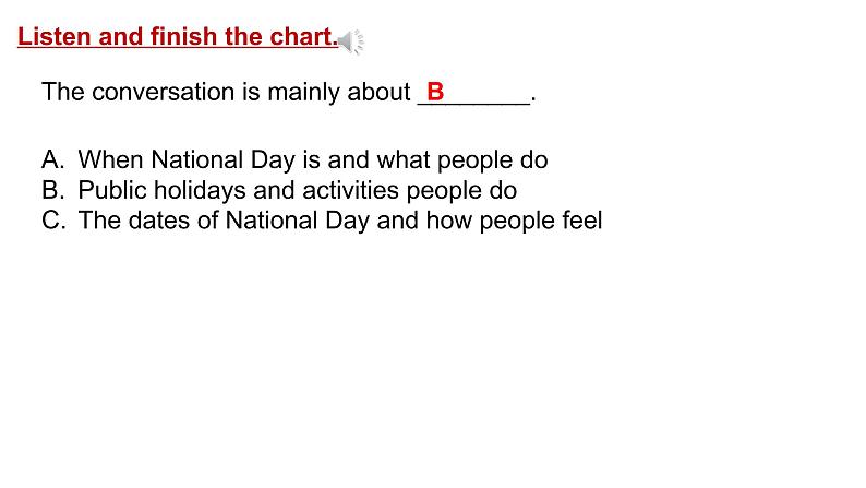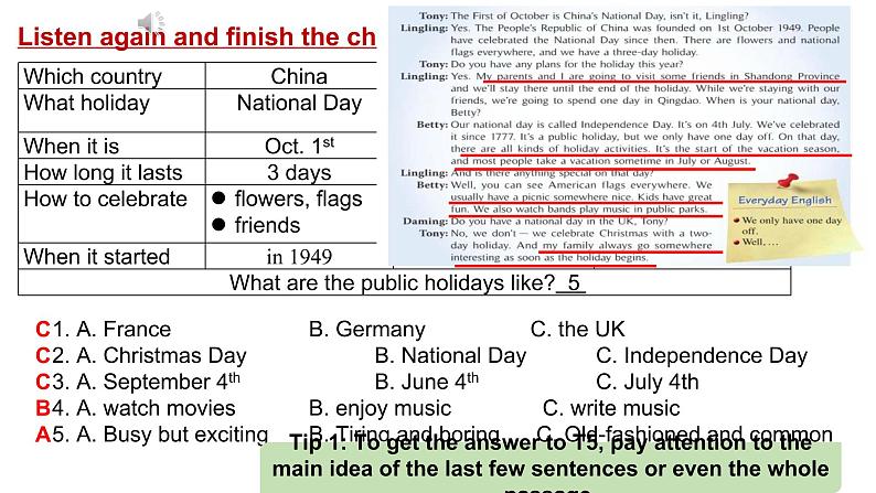 1. A. FranceB. Germany C. the UK 2. A. Christmas DayB. Natinal Day C. Independence Day 3. A. September 4th B. June 4th C. July 4th 4. A. watch mviesB. enjy music C. write music 5. A. Busy but excitingB. Tiring and bring C. Old-fashined and cmmn