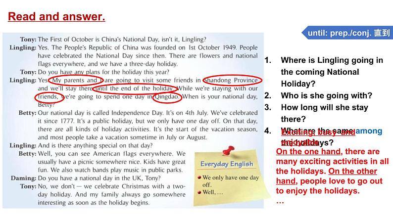 Where is Lingling ging in the cming Natinal Hliday?Wh is she ging with?Hw lng will she stay there?What are the same amng the hlidays?