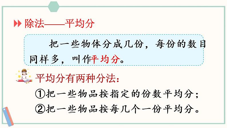 ①把一些物品按指定的份数平均分;②把一些物品按每几个一份平均分。