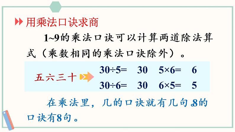 1~9的乘法口诀可以计算两道除法算式(乘数相同的乘法口诀除外)。