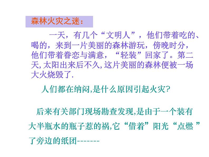 森林中的一块警示牌,上面写有“请不要把装有液体的纯净水瓶或矿泉水瓶遗留在山上”请同学们分析一下这是为什么?