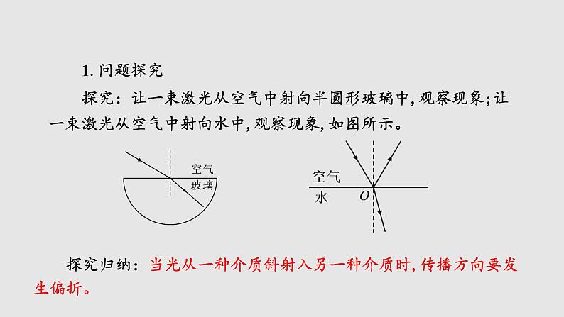 1.问题探究探究:让一束激光从空气中射向半圆形玻璃中,观察现象;让一束激光从空气中射向水中,观察现象,如图所示。