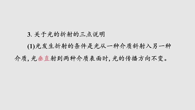 (3)折射是在光从一种透明物质斜射入另一种透明物质的分界面处发生的。因为光是在两种物质里传播的,所以传播的速度各不相同。