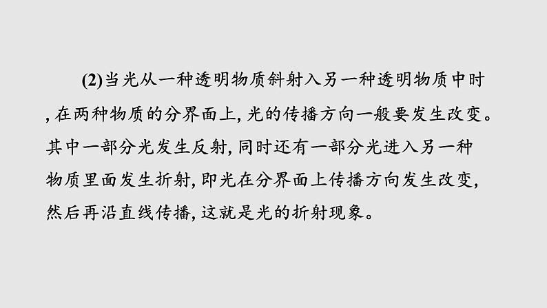 (2)当光从一种透明物质斜射入另一种透明物质中时,在两种物质的分界面上,光的传播方向一般要发生改变。其中一部分光发生反射,同时还有一部分光进入另一种物质里面发生折射,即光在分界面上传播方向发生改变,然后再沿直线传播,这就是光的折射现象。