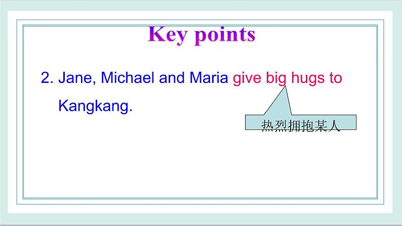 hug n. 拥抱 give a big hug 热烈拥抱in time 及时 n time 按时cnclude v. 推断出 prmise v.& n. 许诺,保证 prmise t d sth. 许诺做某事But yu must prmise t send e-mails t us ften.