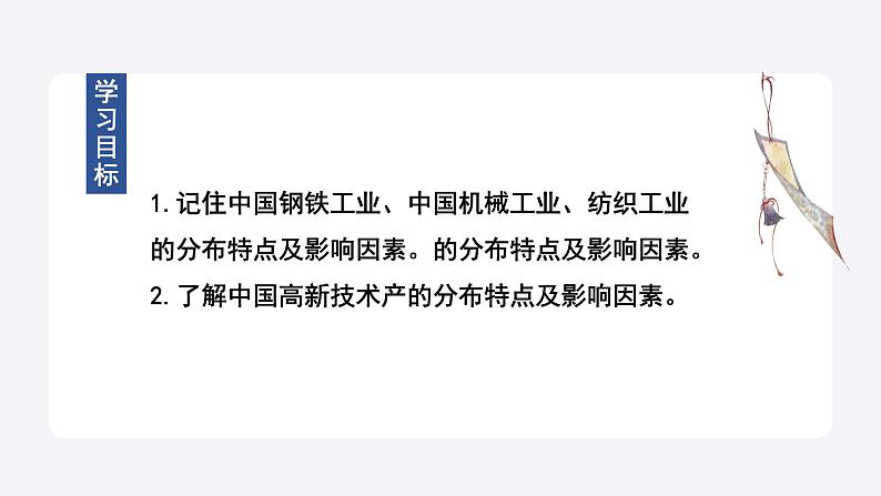 1.记住中国钢铁工业、中国机械工业、纺织工业的分布特点及影响因素。的分布特点及影响因素。2.了解中国高新技术产的分布特点及影响因素。
