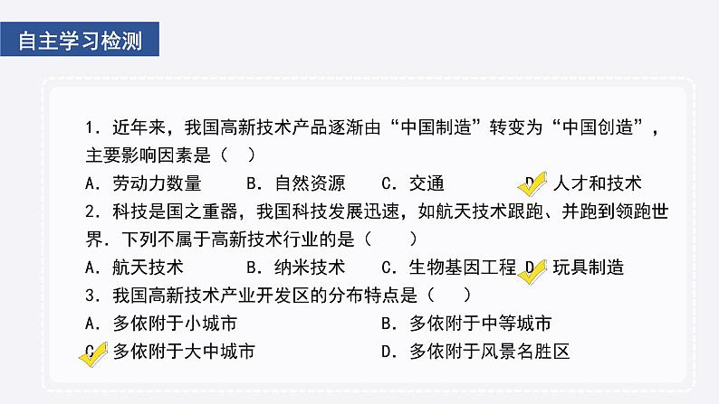 1.近年来,我国高新技术产品逐渐由“中国制造”转变为“中国创造”,主要影响因素是( )A.劳动力数量B.自然资源 C.交通 D.人才和技术2.科技是国之重器,我国科技发展迅速,如航天技术跟跑、并跑到领跑世界.下列不属于高新技术行业的是( )A.航天技术 B.纳米技术 C.生物基因工程 D.玩具制造3.我国高新技术产业开发区的分布特点是( )A.多依附于小城市 B.多依附于中等城市C.多依附于大中城市 D.多依附于风景名胜区