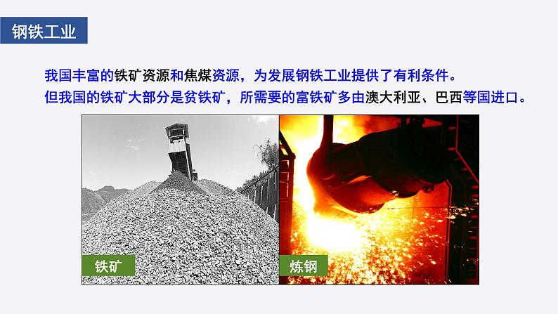 我国丰富的铁矿资源和焦煤资源,为发展钢铁工业提供了有利条件。 但我国的铁矿大部分是贫铁矿,所需要的富铁矿多由澳大利亚、巴西等国进口。