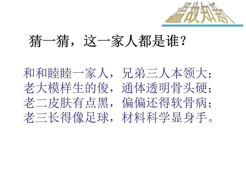 和和睦睦一家人,兄弟三人本领大;老大模样生的俊,通体透明骨头硬;老二皮肤有点黑,偏偏还得软骨病;老三长得像足球,材料科学显身手。