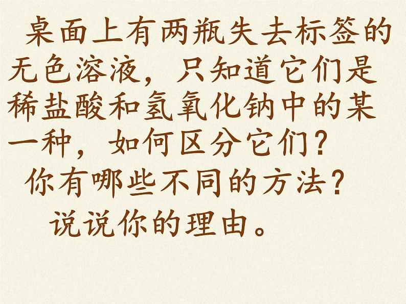 桌面上有两瓶失去标签的无色溶液,只知道它们是稀盐酸和氢氧化钠中的某一种,如何区分它们? 你有哪些不同的方法? 说说你的理由。