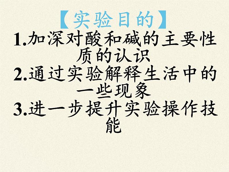 【实验目的】 1.加深对酸和碱的主要性质的认识 2.通过实验解释生活中的一些现象 3.进一步提升实验操作技能
