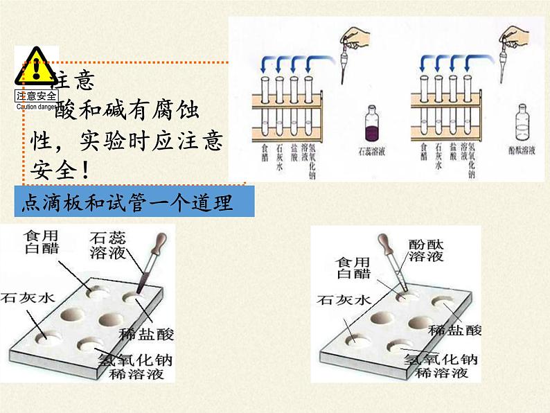 注意 酸和碱有腐蚀性,实验时应注意安全!