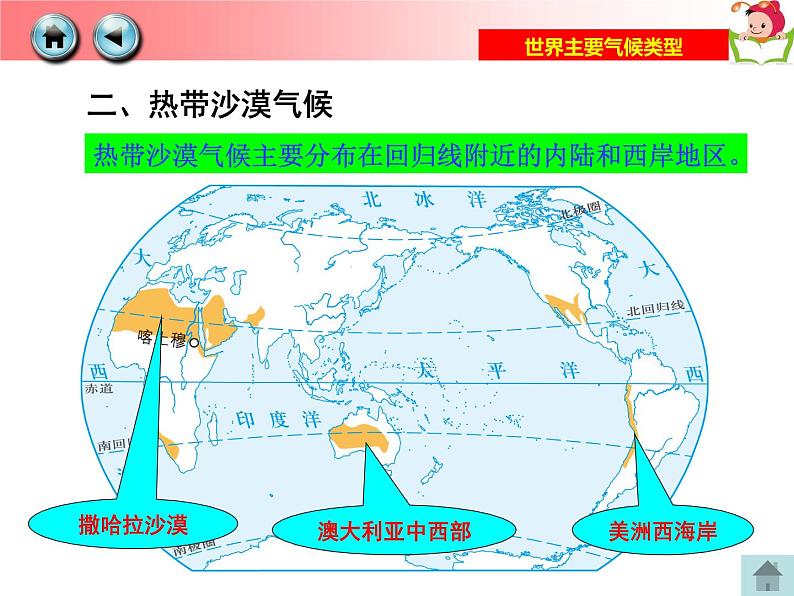 热带沙漠气候主要分布在回归线附近的内陆和西岸地区。