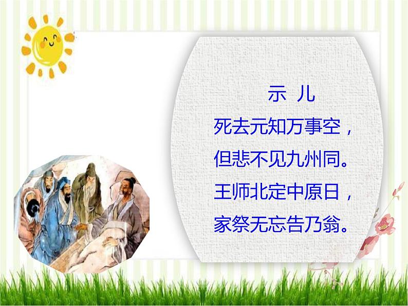 示 儿死去元知万事空,但悲不见九州同。王师北定中原日,家祭无忘告乃翁。