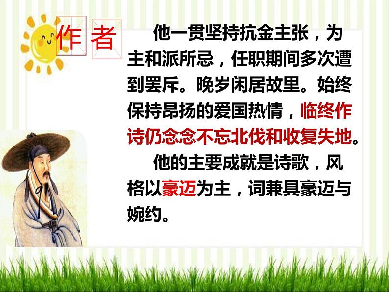 他一贯坚持抗金主张,为主和派所忌,任职期间多次遭到罢斥。晚岁闲居故里。始终保持昂扬的爱国热情,临终作诗仍念念不忘北伐和收复失地。 他的主要成就是诗歌,风格以豪迈为主,词兼具豪迈与婉约。