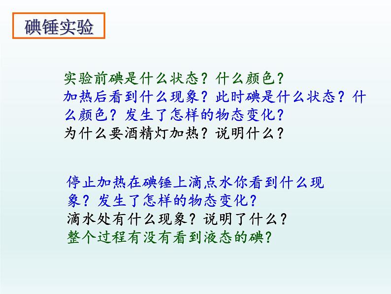 实验前碘是什么状态?什么颜色?加热后看到什么现象?此时碘是什么状态?什么颜色?发生了怎样的物态变化?为什么要酒精灯加热?说明什么?