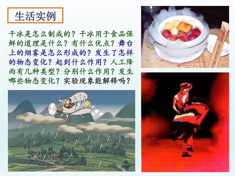 干冰是怎么制成的?干冰用于食品保鲜的道理是什么?有什么优点?舞台上的烟雾是怎么形成的?发生了怎样 的物态变化?起到什么作用?人工降雨有几种类型?分别什么作用?发生哪些物态变化?实验现象能解释吗?