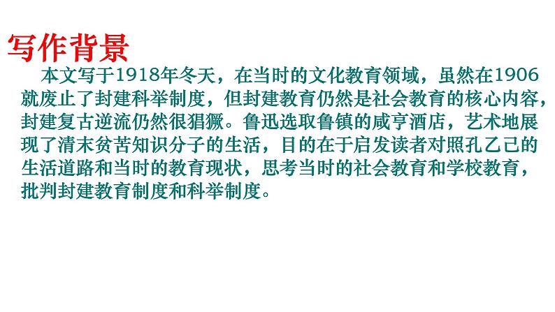本文写于1918年冬天,在当时的文化教育领域,虽然在1906就废止了封建科举制度,但封建教育仍然是社会教育的核心内容,封建复古逆流仍然很猖獗。鲁迅选取鲁镇的咸亨酒店,艺术地展现了清末贫苦知识分子的生活,目的在于启发读者对照孔乙己的生活道路和当时的教育现状,思考当时的社会教育和学校教育,批判封建教育制度和科举制度。