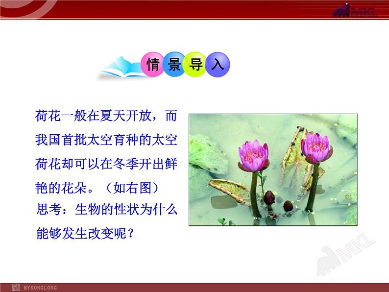 荷花一般在夏天开放,而我国首批太空育种的太空荷花却可以在冬季开出鲜艳的花朵。(如右图)