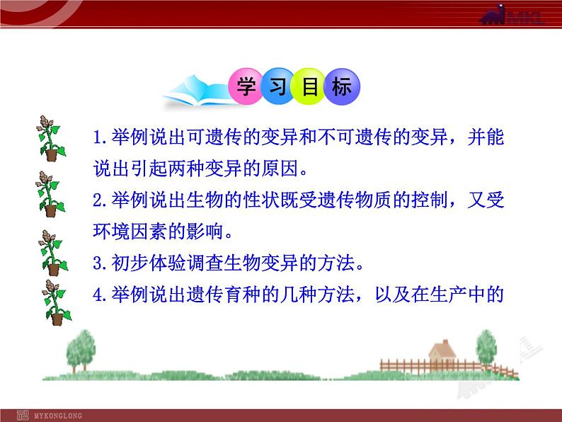 1.举例说出可遗传的变异和不可遗传的变异,并能说出引起两种变异的原因。2.举例说出生物的性状既受遗传物质的控制,又受环境因素的影响。3.初步体验调查生物变异的方法。4.举例说出遗传育种的几种方法,以及在生产中的应用。