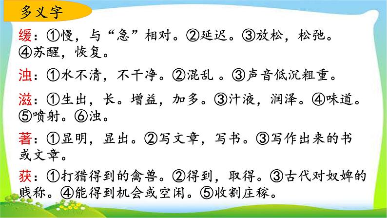 缓:①慢,与“急”相对。②延迟。③放松,松弛。④苏醒,恢复。