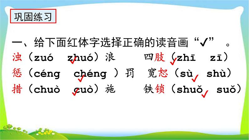一、给下面红体字选择正确的读音画“✔” 。浊(zuó zhuó)浪 四肢(zhī zī)惩(cénɡ chénɡ )罚 宽恕(sù shù)措(chuò cuò)施 铁锁(shuǒ suǒ)
