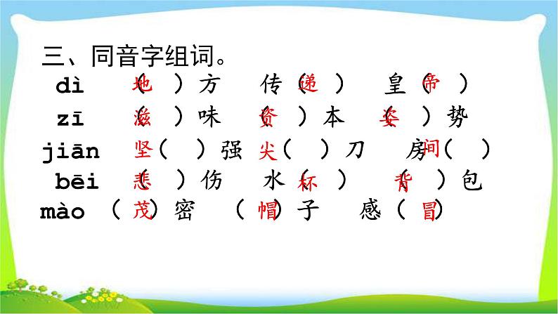 三、同音字组词。 dì ( )方 传( ) 皇( ) zī ( )味 ( )本 ( )势jiān ( )强 ( )刀 房( ) bēi ( )伤 水( ) ( )包mà ( )密 ( )子 感( )