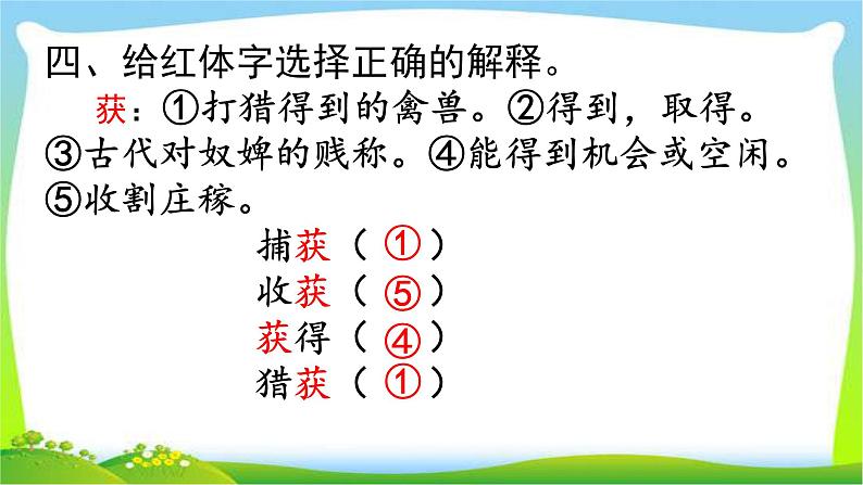 四、给红体字选择正确的解释。 获:①打猎得到的禽兽。②得到,取得。③古代对奴婢的贱称。④能得到机会或空闲。⑤收割庄稼。 捕获( ) 收获( ) 获得( ) 猎获( )
