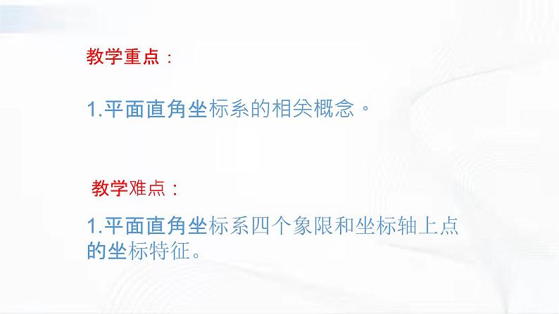 1、平面直角坐标系的概念。2、能在平面直角坐标系中,根据坐标找出点,由点描出坐标。坐标平面内的点与有序实数对是一一 对应的。3、平面直角坐标系四个象限和坐标轴上点的坐标特征。4、坐标轴的夹角平分线的点的坐标特征。