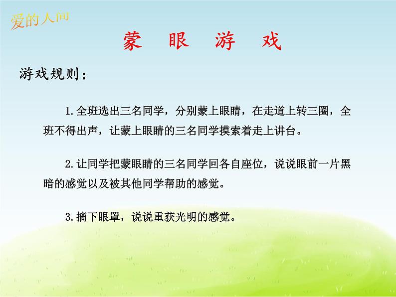 1.全班选出三名同学,分别蒙上眼睛,在走道上转三圈,全班不得出声,让蒙上眼睛的三名同学摸索着走上讲台。