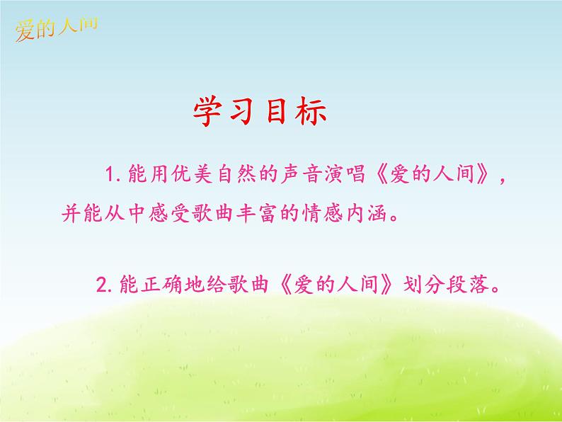 1.能用优美自然的声音演唱《爱的人间》,并能从中感受歌曲丰富的情感内涵。