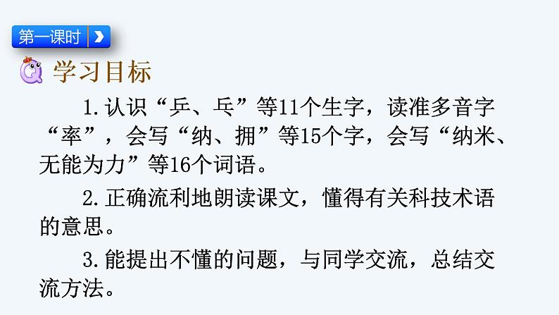 1.认识“乒、乓”等11个生字,读准多音字“率”,会写“纳、拥”等15个字,会写“纳米、无能为力”等16个词语。