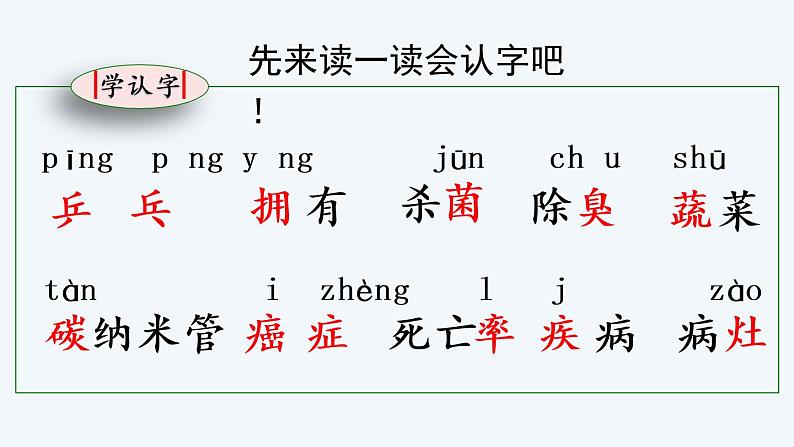 这是一份人教部编版第二单元7 纳米技术就在我们身边背景图ppt课件,共37页。PPT课件主要包含了纳米技术就在我们身边,chòu臭味,xiù乳臭未干,lǜ效率,shuài草率,纳米涂层,碳纳米管,纳米吸波材料,纳米机器人,纳米检测技术等内容,欢迎下载使用。