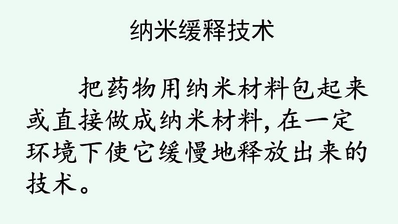 生病的时候,需要吃药。现在吃一次药最多管一两天,未来的纳米缓释技术,能够让药物效力缓慢地释放出来,服一次药可以管一周,甚至一个月。