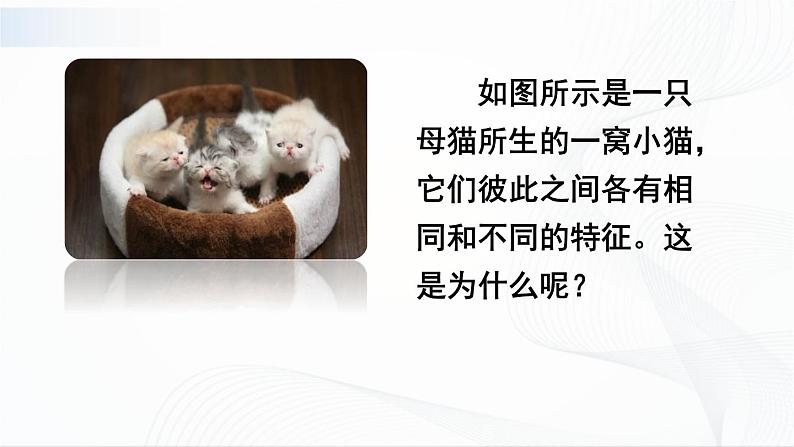 人教版 (新课标)八年级下册第七单元 生物圈中生命的延续和发展第二章 生物的遗传和变异第一节 基因控制生物的性状图片ppt课件: 这是一份人教版 (新课标)八年级下册第七单元 生物圈中生命的延续和发展第二章 生物的遗传和变异第一节 基因控制生物的性状图片ppt课件,共22页。PPT课件主要包含了学习目标,遗传和变异,相似性,子代个体,考考你,探究新知,双单眼皮,黑眼睛,皮肤颜色,惯用右手等内容,欢迎下载使用。