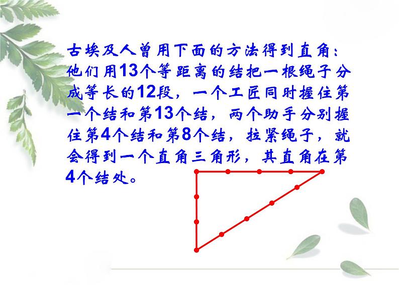 展开古埃及人曾用下面的方法得到直角:他们用13个等距离的结把一根绳子分成等长的12段,一个工匠同时握住第一个结和第13个结,两个助手分别握住第4个结和第8个结,拉紧绳子,就会得到一个直角三角形,其直角在第4个结处。