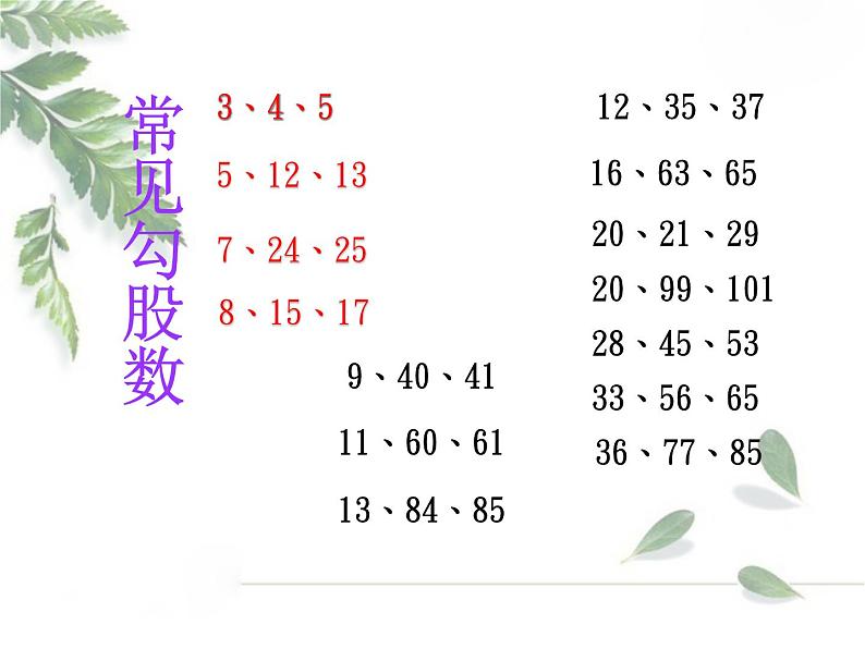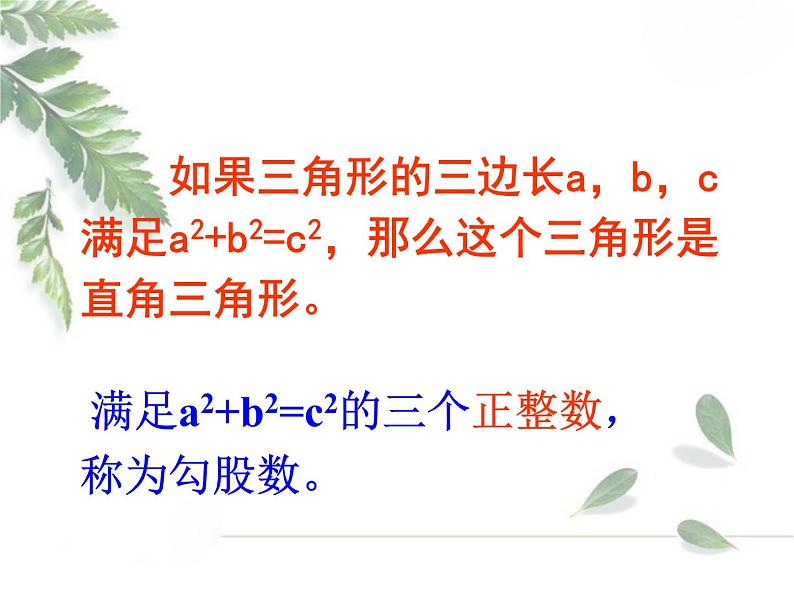 如果三角形的三边长a,b,c 满足a2+b2=c2,那么这个三角形是直角三角形。 满足a2+b2=c2的三个正整数, 称为勾股数。