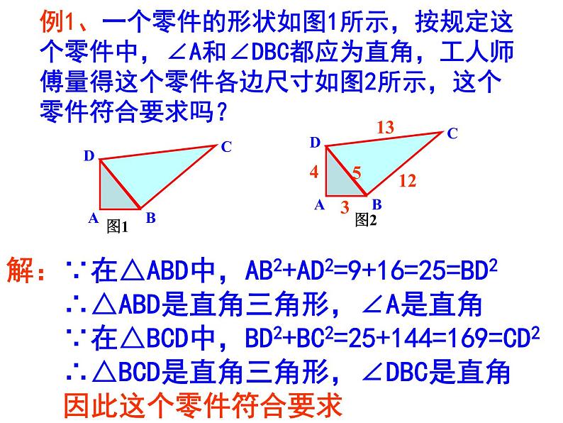 例1、一个零件的形状如图1所示,按规定这个零件中,∠A和∠DBC都应为直角,工人师傅量得这个零件各边尺寸如图2所示,这个零件符合要求吗?