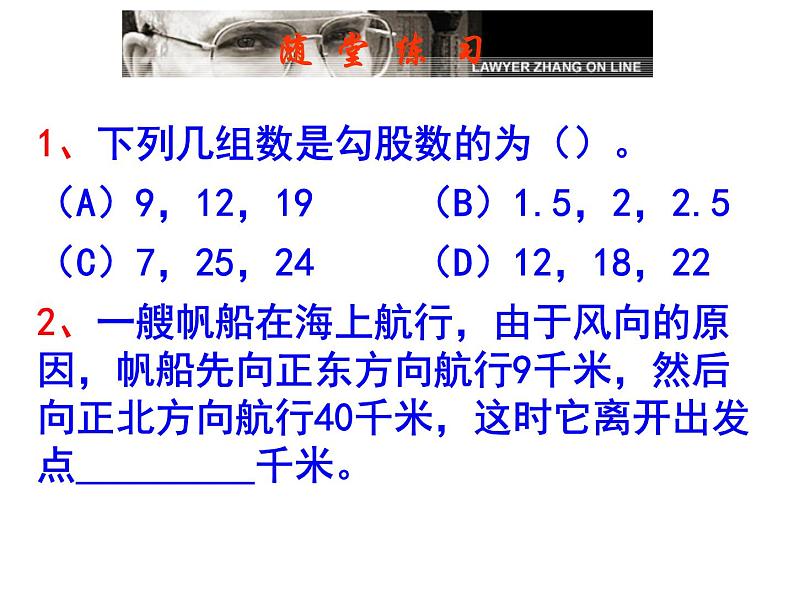 1、下列几组数是勾股数的为()。(A)9,12,19 (B)1.5,2,2.5(C)7,25,24 (D)12,18,22 2、一艘帆船在海上航行,由于风向的原因,帆船先向正东方向航行9千米,然后向正北方向航行40千米,这时它离开出发点_________千米。