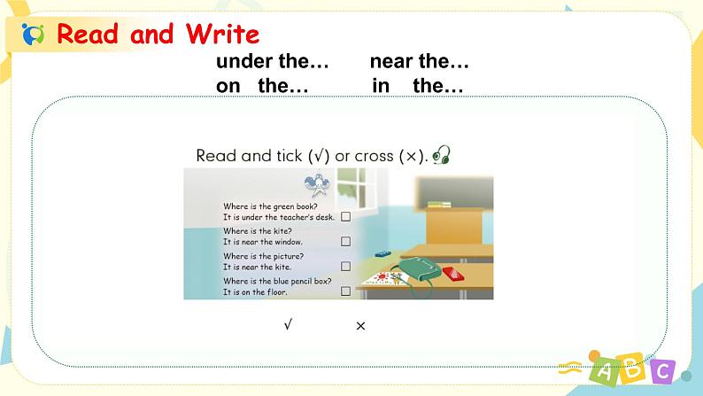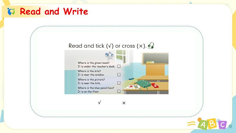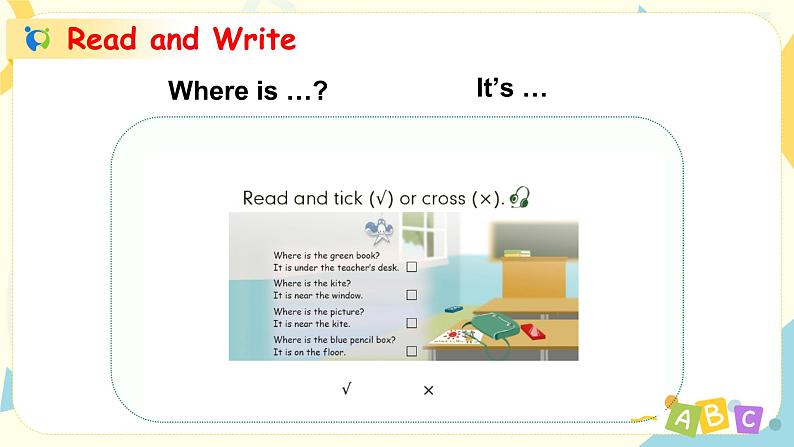 这是一份小学英语人教版 (PEP)四年级上册Unit 1 My classroom Part B优质教学ppt课件,文件包含人教版PEP四上《Unit1MyclassroomPartBReadandwrite》课件pptx、人教版PEP四上《Unit1MyclassroomPartBReadandwrite》教学设计docx、Listenandtickorcross课文录音mp3、Readandwrite课文录音mp3、check1MP3、check2MP3、check3MP3、circleAMP3、circleBMP3、Letsdoswf、Letssing_clip_兼容格式AVI_320x240AVI、chooseswf、circleswf、listenswf、readSWF、singswf等16份课件配套教学资源,其中PPT共27页, 欢迎下载使用。