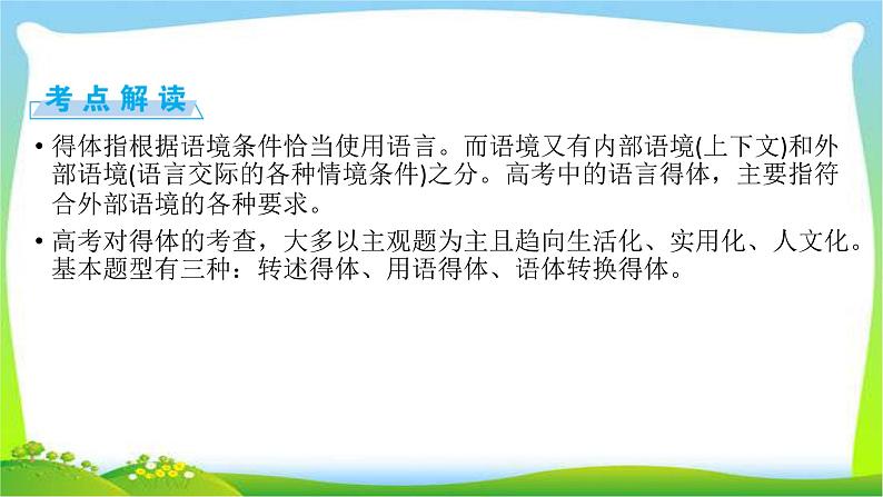 得体指根据语境条件恰当使用语言。而语境又有内部语境(上下文)和外部语境(语言交际的各种情境条件)之分。高考中的语言得体,主要指符合外部语境的各种要求。高考对得体的考查,大多以主观题为主且趋向生活化、实用化、人文化。基本题型有三种:转述得体、用语得体、语体转换得体。