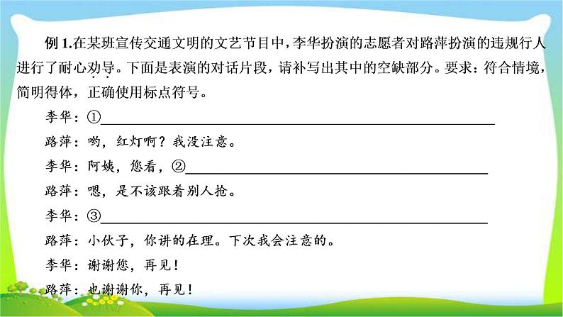 【解析】 本题用情景对话的形式考查语言的连贯、得体。题干中对“劝导”二字加注了黑点,是提醒我们对话的内容和语气。作答时,应根据题中所设对话情境,设身处地的来补写空缺的内容,①处应据路萍的“红灯啊?我没注意”推知所填内容应是对路萍闯红灯行为的责问,只是表达要委婉、得体。②处据下文“是不该跟着别人抢”推知,应该补写抢红灯的危害。③处据下文“你讲的在理”推知,应该补写遵守交通规则的好处。【答案】 (示例)①阿姨,您好!刚才是红灯,您怎么就过来了?②跟车抢红灯,多危险啊!再说,大家这样抢红灯,也容易影响交通;这不,堵上了。③人人遵守交规,大家出行才会安全、顺畅。阿姨,您看我的话对吗?