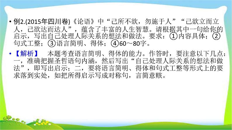 例2.(2015年四川卷)《论语》中“己所不欲,勿施于人”“己欲立而立人,己欲达而达人”,蕴含了丰富的人生智慧。请根据其中一句给你的启示,写出自己处理人际关系的想法和做法。要求:①内容具体;②句式工整;③语言简明、得体;④60~80字。【解析】 本题考查语言简明、得体的能力。作答时,要注意以下几点:一,准确把握圣哲语句内涵,然后写出“自己处理人际关系的想法和做法”,即写出启示;二,要将语言简明、得体和句式工整等形式上的要求落到实处,如把所得启示写成对称句,言简意赅。