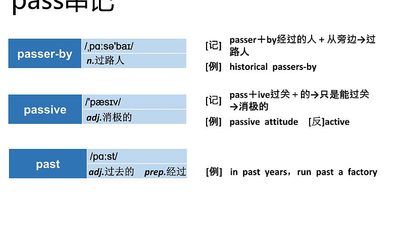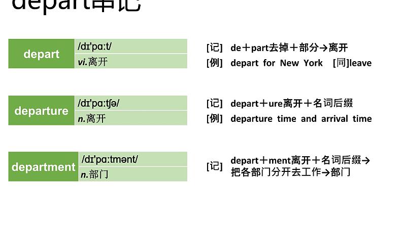 这是一份高考英语实用复习结构法记词-17优质课件PPT,共28页。PPT课件主要包含了高考词汇精讲,depart串记, ,vi离开,n离开,n部门,pass串记,v经过传递,n乘客,n过路人等内容,欢迎下载使用。