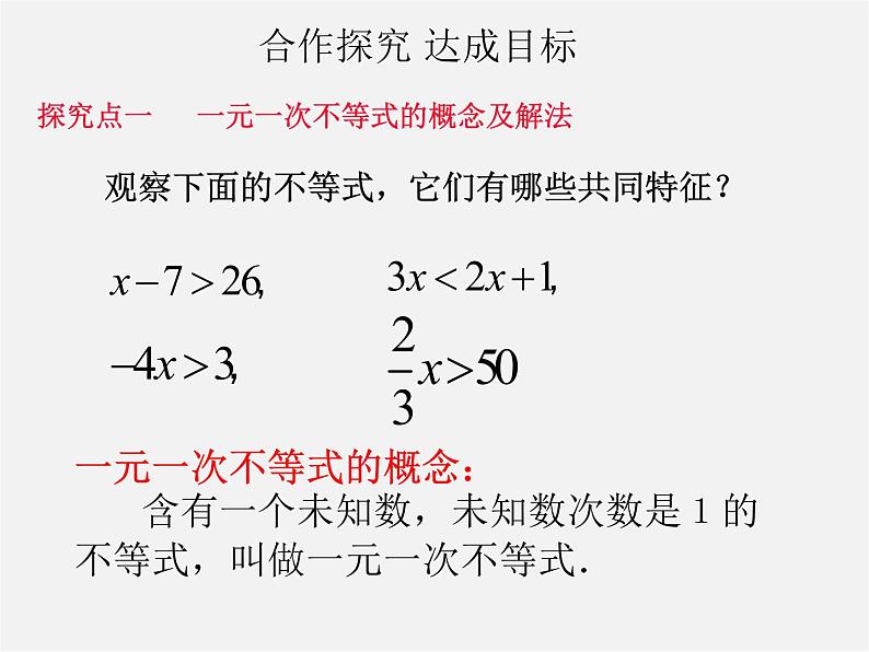 一元一次不等式的概念: 含有一个未知数,未知数次数是1的不等式,叫做一元一次不等式.
