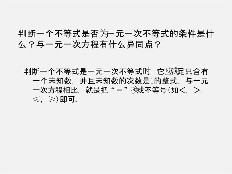 判断一个不等式是否为一元一次不等式的条件是什么?与一元一次方程有什么异同点?