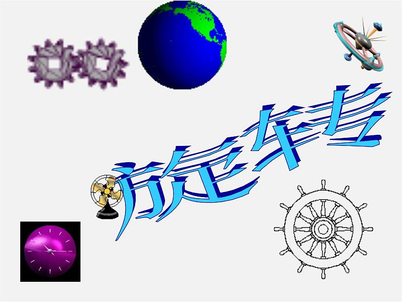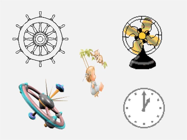 (1)上面情景中的转动现象,有什么共同的特征?(2)钟表的指针、秋千在转动过程中,其形状、大小、位置是否发生变化呢?