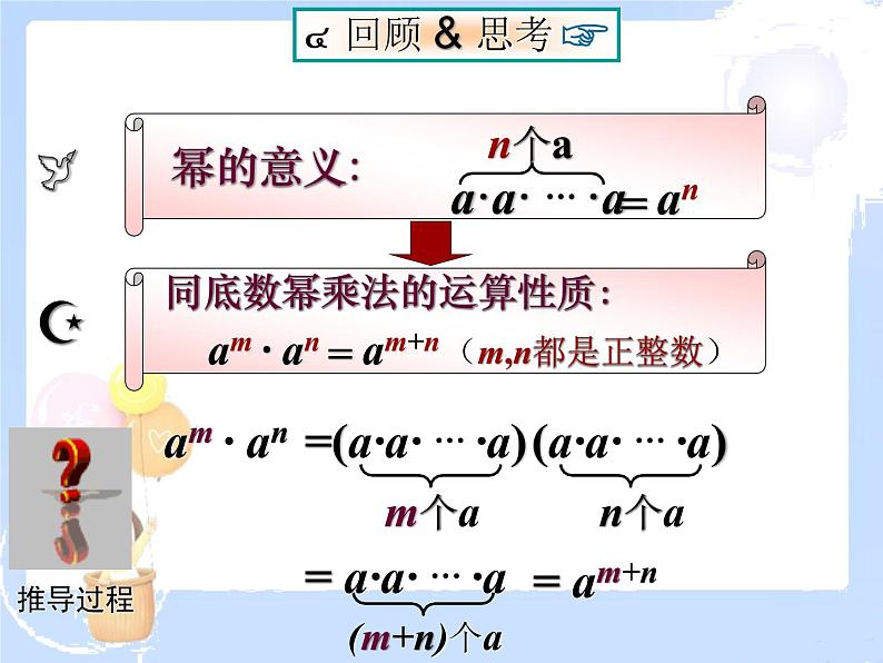 这是一份初中数学北师大版七年级下册2 幂的乘方与积的乘方评课课件ppt,共18页。PPT课件主要包含了am·an,am+n,幂的意义,边长比的,半径比的,102+2+2,102×3,同底数幂的乘法性质,3am2,62+2+2+2等内容,欢迎下载使用。