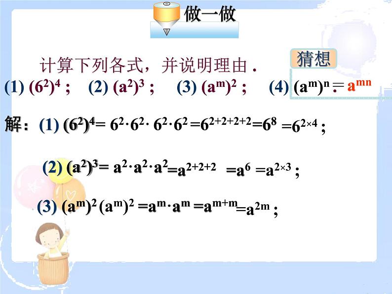 计算下列各式,并说明理由 .(1) (62)4 ; (2) (a2)3 ; (3) (am)2 ; (4) (am)n .