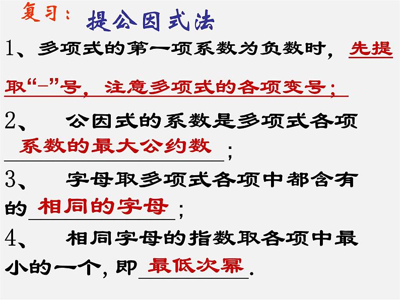 2、 公因式的系数是多项式各项__________________; 3、 字母取多项式各项中都含有的____________; 4、 相同字母的指数取各项中最小的一个,即_________.